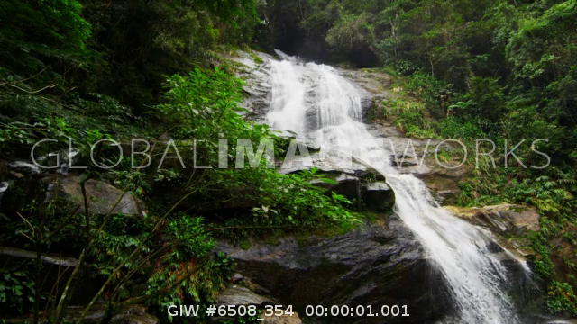 Slow motion shot of a jungle waterfall cascading down a dark rocky outcropping into a green pool.