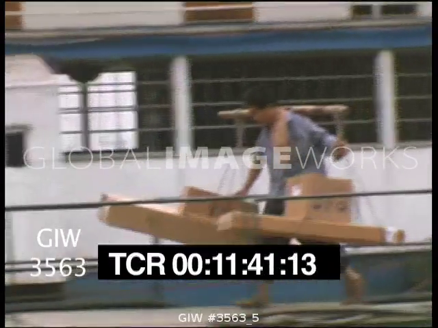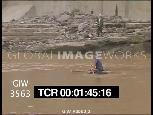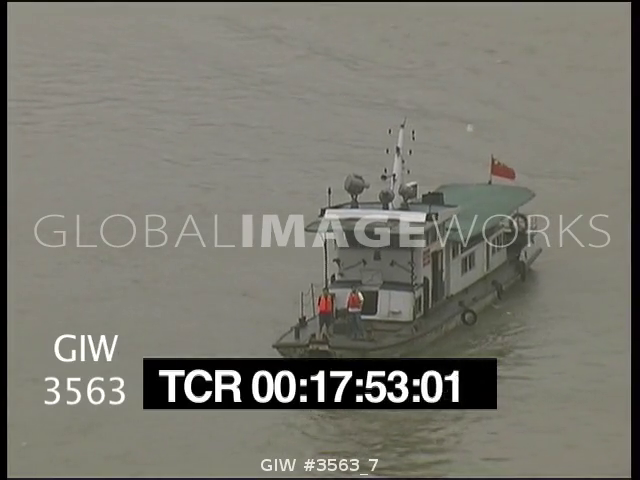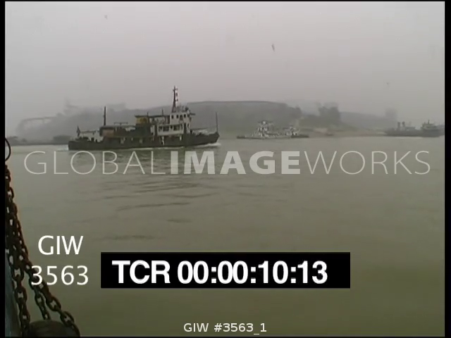 Ferry travels on dirty polluted river, lots of smog